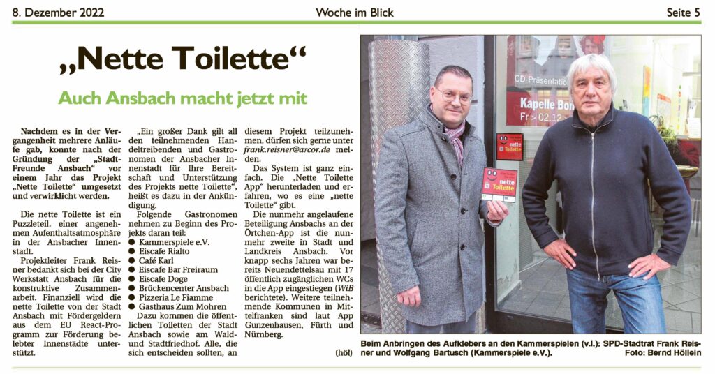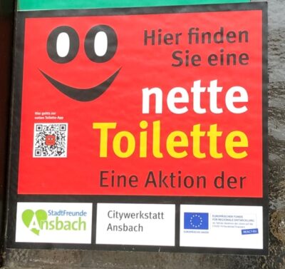 Dann ist jetzt eine überaus einfache Gelegenheit, bei der Sie mitmachen können. Denn im Rahmen der Citywerkstatt Ansbach – einer gemeinsamen Aktion von Stadt Ansbach und IHK-Gremium Ansbach – gibt es das Projekt „Nette Toilette“, das zurückgeht auf eine Idee der StadtFreunde Ansbach e.V.