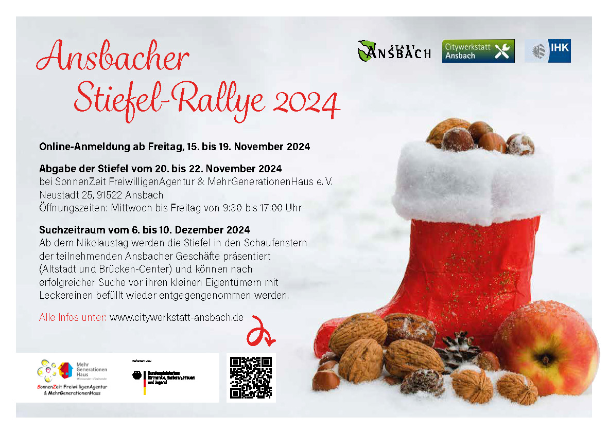 Mit dem Projekt „Ansbacher Stiefel-Rallye“ wollen wir die Erlebnisqualität der Ansbacher Innenstadt in der Vorweihnachtszeit erhöhen. Kinder von 1 bis 10 Jahren können einen leeren Stiefel rechtzeitig vor dem Nikolaustag in der „Sonnenzeit Freiwilligenagentur & Mehrgenerationenhaus e.V., Neustadt 25, Ansbach“ abgeben. Ansbacher Händlerinnen und Händler befüllen die Kinderstiefel mit Leckereien und ab dem Nikolaustag können die Kinder in Ansbacher Geschäften nach ihrem gefüllten Stiefel suchen und ihn wieder mit nach Hause nehmen.